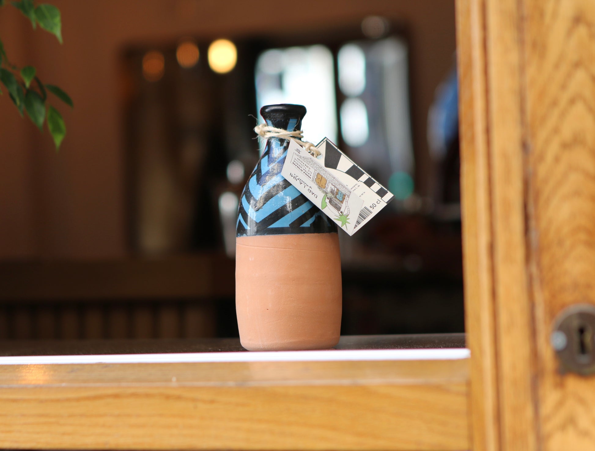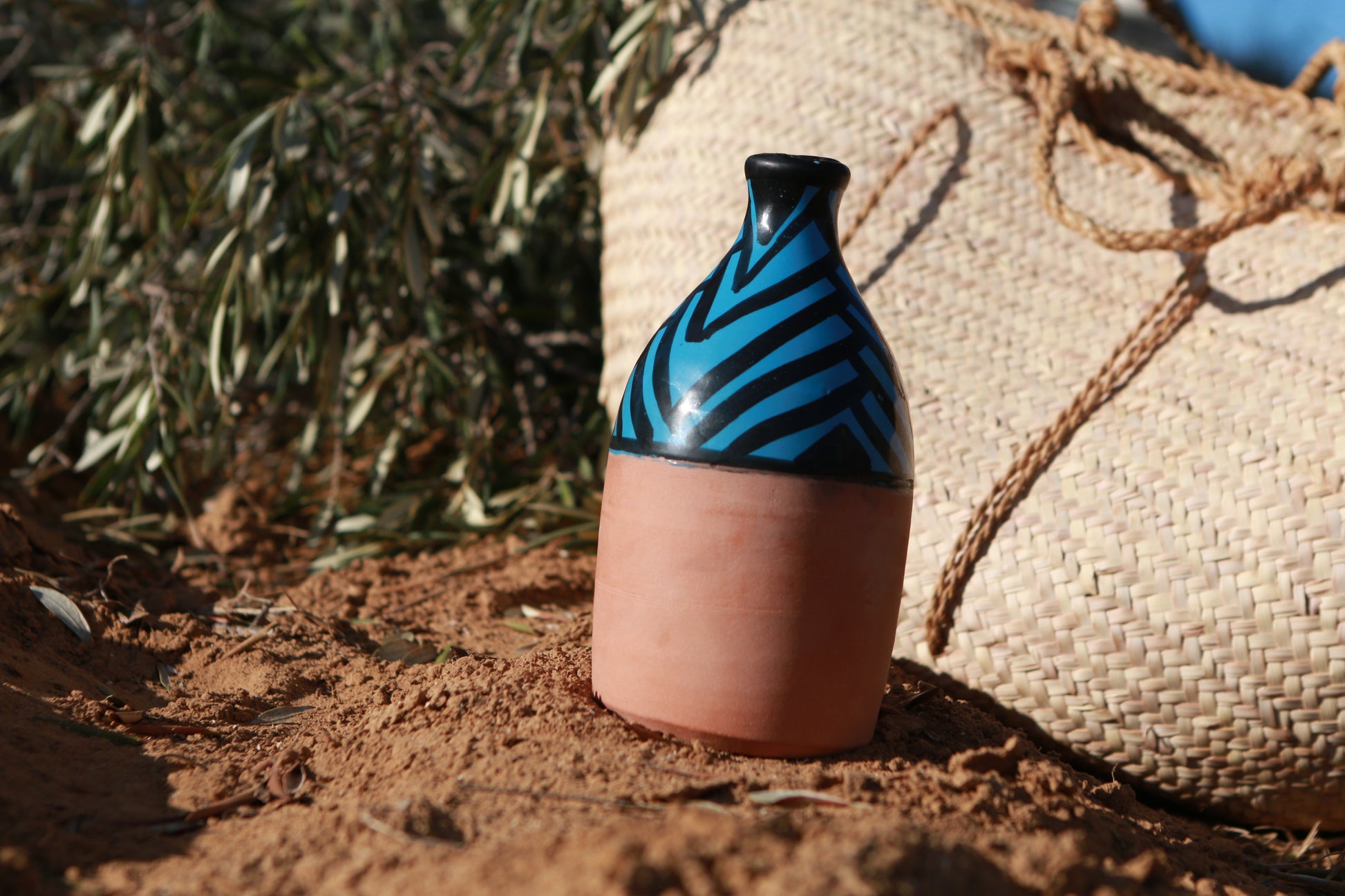 La bouteille, tournée à la main, est émaillée dans sa moitié supérieure d’un bleu cobalt profond.